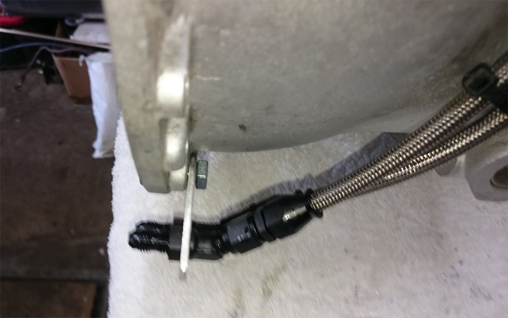 In das Getriebegehäuse wurden zwei Löcher gebohrt, um die Schläuche für Hydraulik und Entlüftung unterzubringen. Aus dem Getriebegehäuse sind wir mit entsprechenden Verschraubungen gegangen.